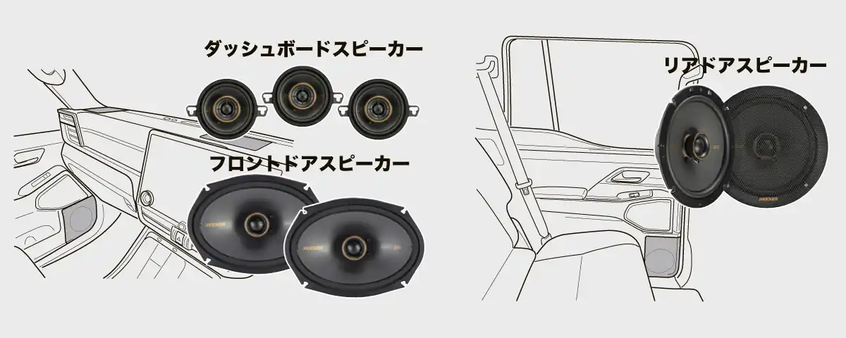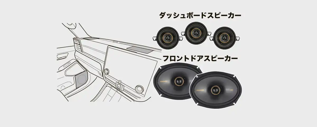 ダッシュ左右/ダッシュセンター 8.9cm同軸スピーカー KSC3504 + フロントドア左右 16×23cm同軸スピーカー KSC6904(計5スピーカー)+ 取り付けキット一式