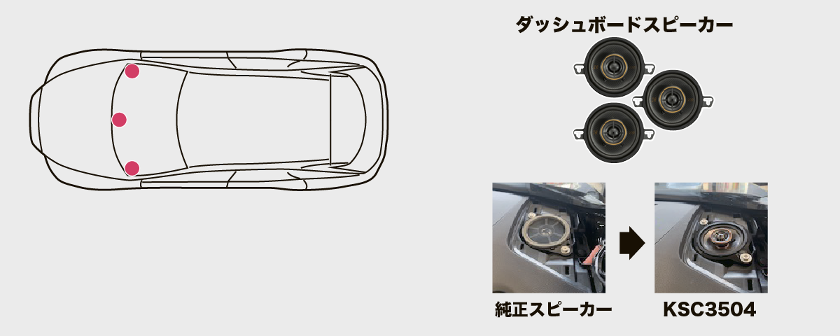 ダッシュ左右/ダッシュセンター 8.9センチ同軸スピーカー KSC3504 + フロントドア左右 16.5cmスピーカー KSC6704(計5スピーカー)+ 取り付けキット一式