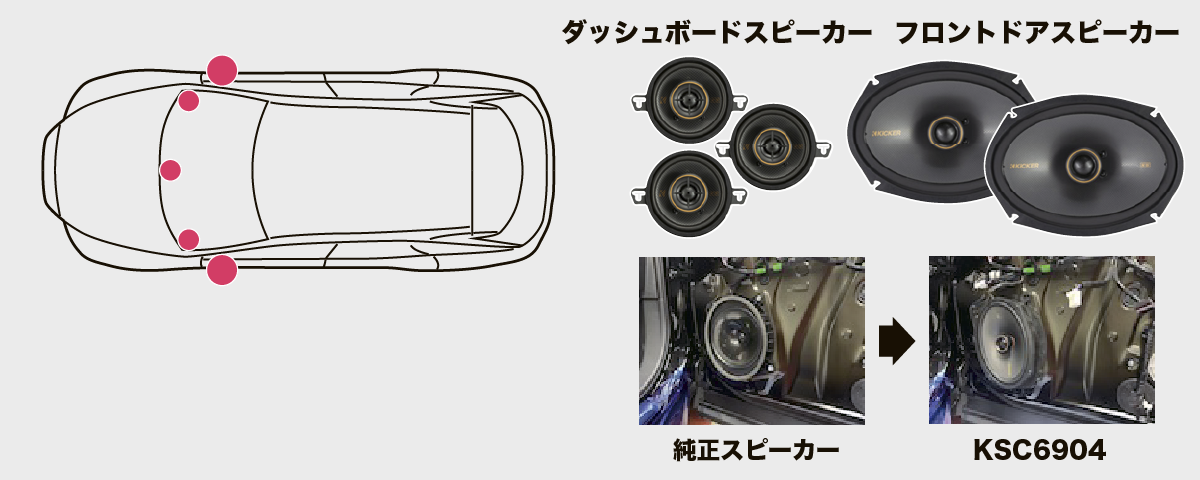 ダッシュ左右/ダッシュセンター 8.9cm同軸スピーカー KSC3504 + フロントドア左右16×23cm同軸スピーカー KSC6904(計5スピーカー)+ 取り付けキット一式