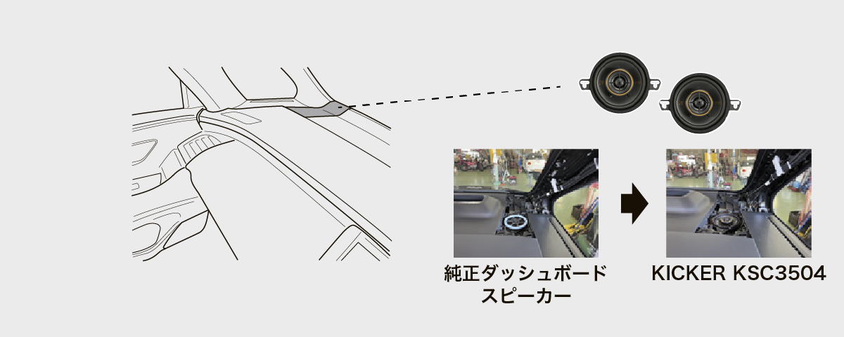 ダッシュ左右/ダッシュセンター 8.9cm同軸スピーカー KSC3504 + フロントドア左右 16.5cmスピーカーとツイーター KSS6904(計7スピーカー)+ 取り付けキット一式
