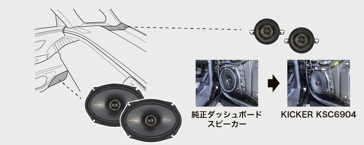 ダッシュ左右 8.9cm同軸スピーカー KSC3504+フロントドア左右16×23cm同軸スピーカーKSC6904(計4スピーカー)+ 取り付けキット一式