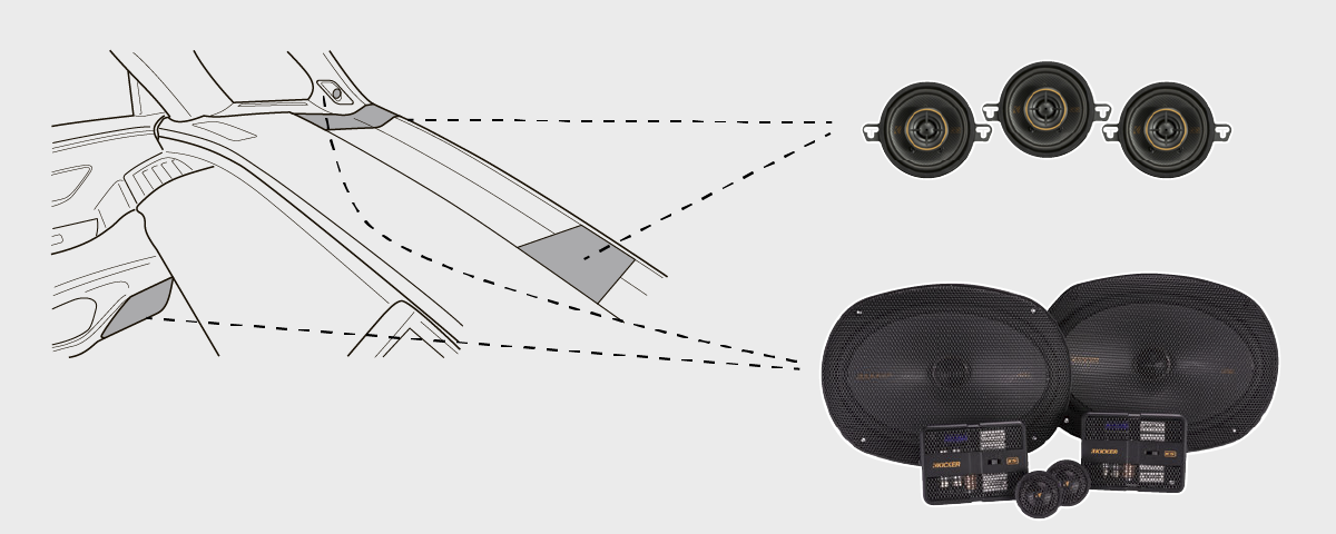 5-⑤ダッシュ左右+ダッシュセンター+Aピラー左右+フロントドア左右+リアドアスピーカー左右(ツイーター左右とウーファー左右) +バックドアサブウーファー